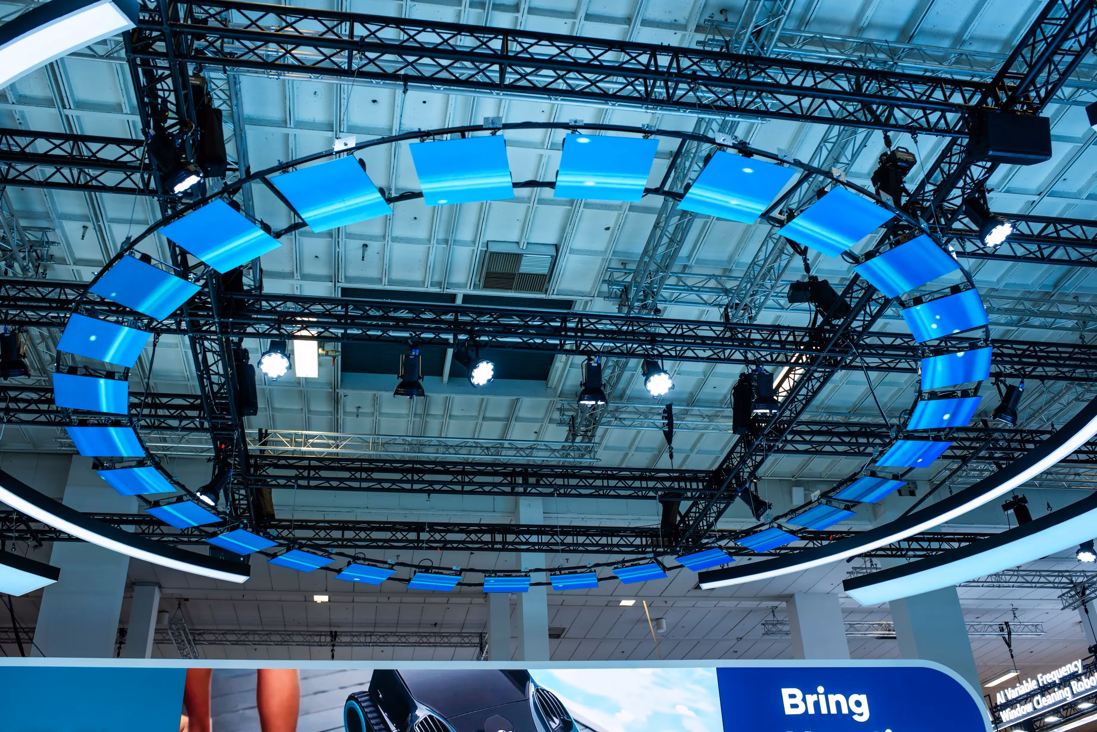 SQM was responsible for end-to-end delivery, including structural rigging, LED setup, projection calibration, lighting and audio integration, and video production. Our team of 44 technicians coordinated all installations, ensuring seamless synchronization across booths and uninterrupted performance throughout the trade show.